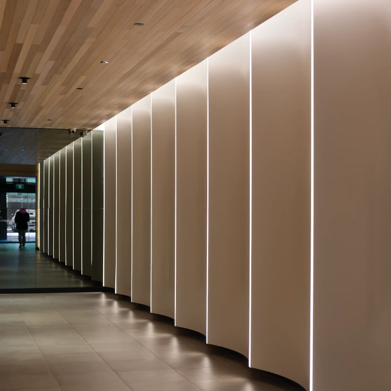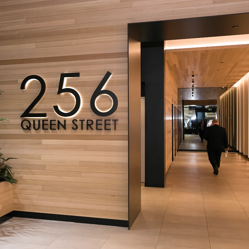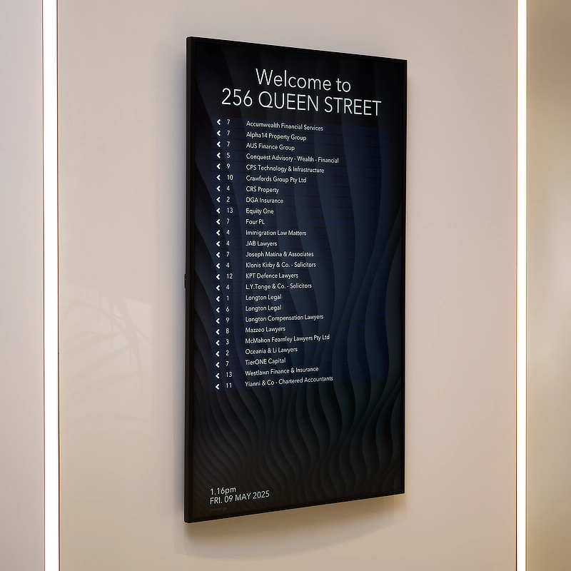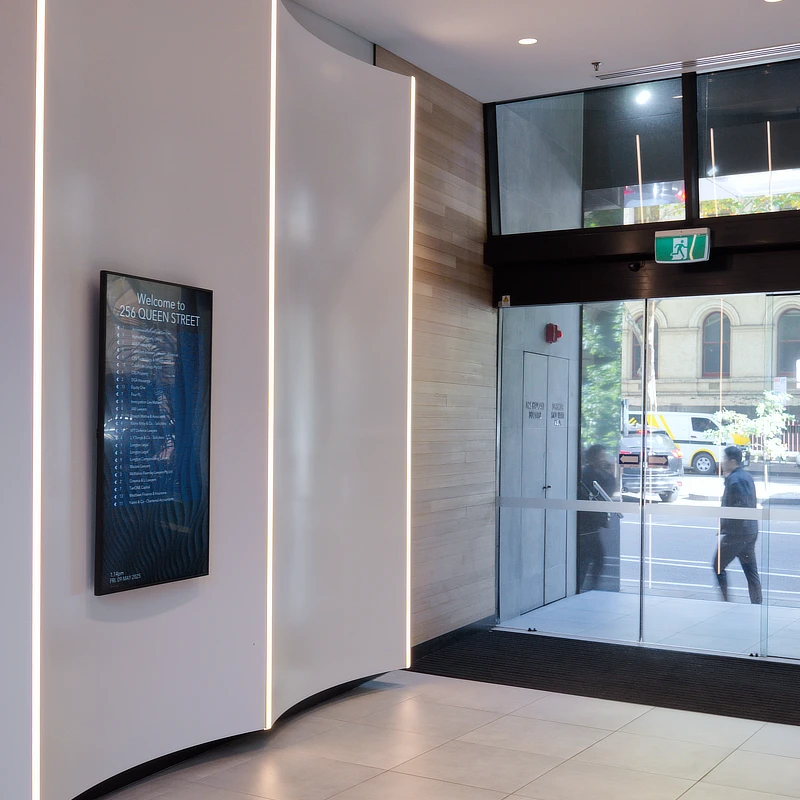 Man walking down wood panelled corridor towards lifts at 256 Queen Street Close up of Surface Mount Digital Directory on concave wall pattern in modern office building at 256 Queen Street Melbourne Image of Surface Mount Digital Directory near door way in modern office building at 256 Queen Street Melbourne Woman walking down wood fluted corridor towards lifts at 256 Queen Street View out through the window to the street from 256 Queen Street Close up of Surface Mount Digital Directory screen at 256 Queen Street Melbourne