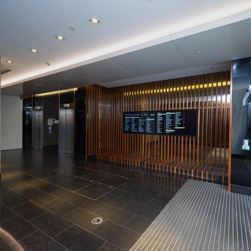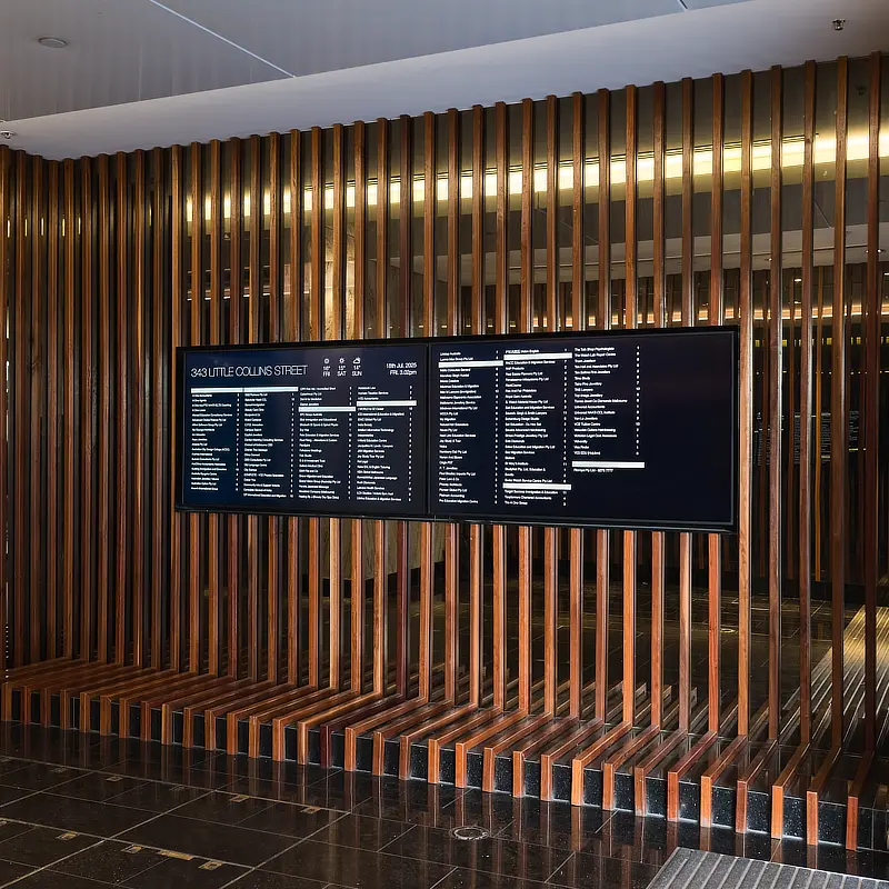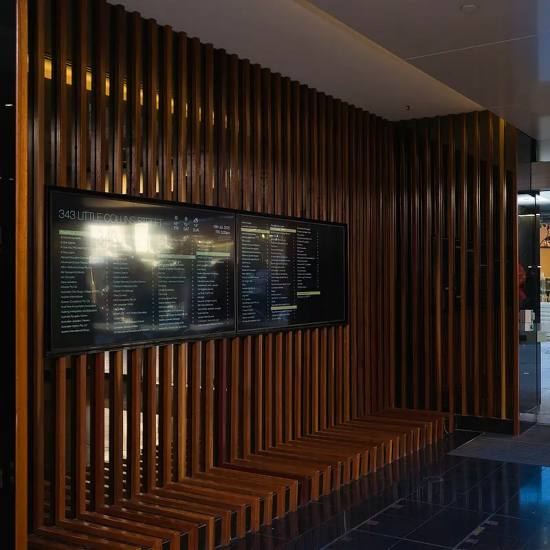 The GO Multi-Screen system embedded within the wood paneled foyer at 343 Little Collins Street offers rich media content across two linked screens. Weather, Tenants and Time—it’s all displayed with clarity and scale. Made in Australia and driven by the intuitive GO software, updates are simple. It fits the space like a glove while offering the flexibility to grow. Stylish, practical, and impossible to ignore.