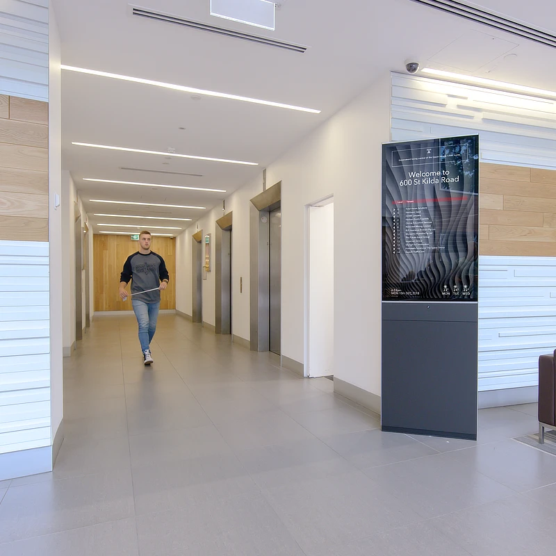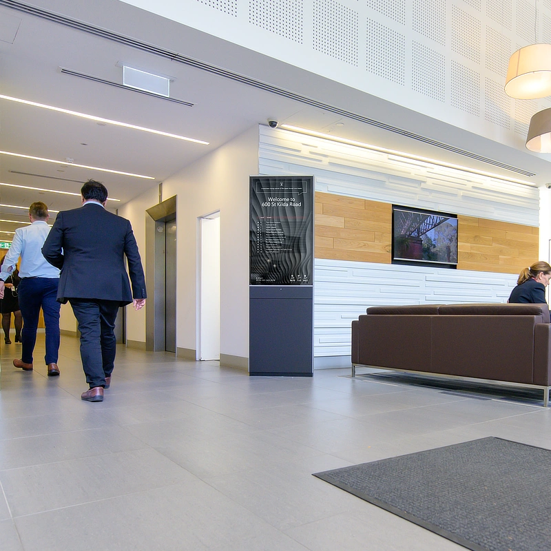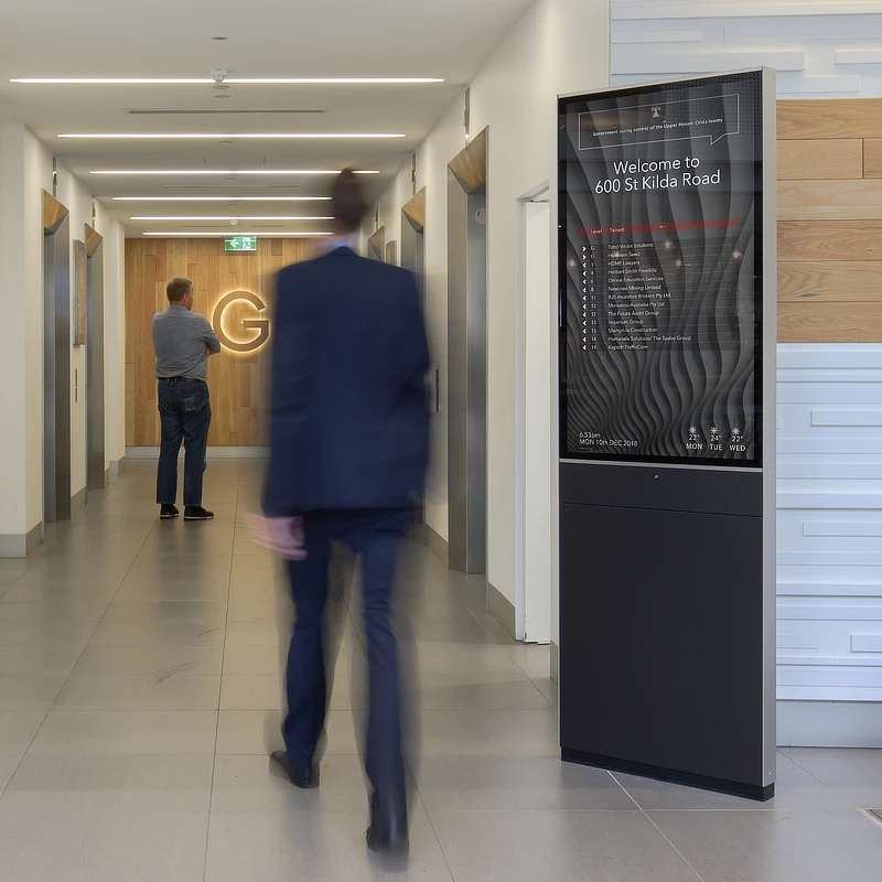 Efficiency meets aesthetics at 600 St Kilda Road with the GO Freestanding A55.FP. Mounted in the middle of this bright building foyer, the 55” screen displays multiple tenants with space left for weather and news. Updates via the GO software are fast and remote. This Australian-built Directory enhances this space. Its a solid and valuable addition to any commercial property.